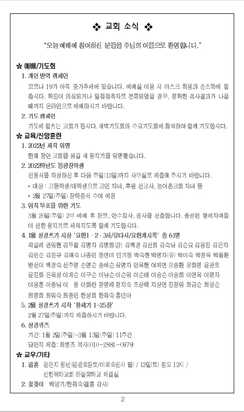 2022³â 1¿ù 2ÀÏ ±³È¸ÁÖº¸_¼ºÅºÀý µÑ°ÁÖÀÏ/»õÇØÁÖÀÏ