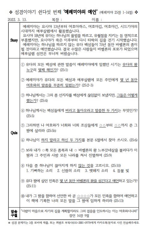 [¼º°æÄûÁî´ëȸ] ¼º°æÀ̾߱⠽®´Ù¼¸¹øÂ° ¡®¿¹·¹¹Ì¾ßÀÇ ¿¹¾ð¡¯ (¿¹·¹¹Ì¾ß 25:1~14)