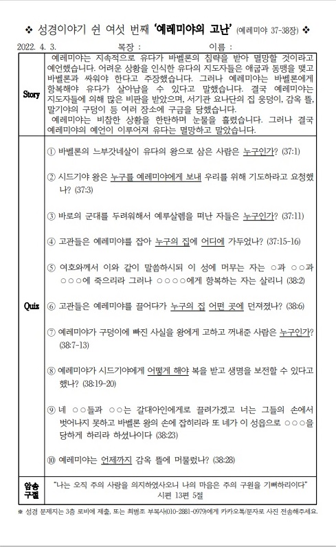 [¼º°æÄûÁî´ëȸ] ¼º°æÀ̾߱⠽®¿©¼¸¹øÂ° ¡®¿¹·¹¹Ì¾ßÀÇ °í³¡¯ (¿¹·¹¹Ì¾ß 37~38Àå)