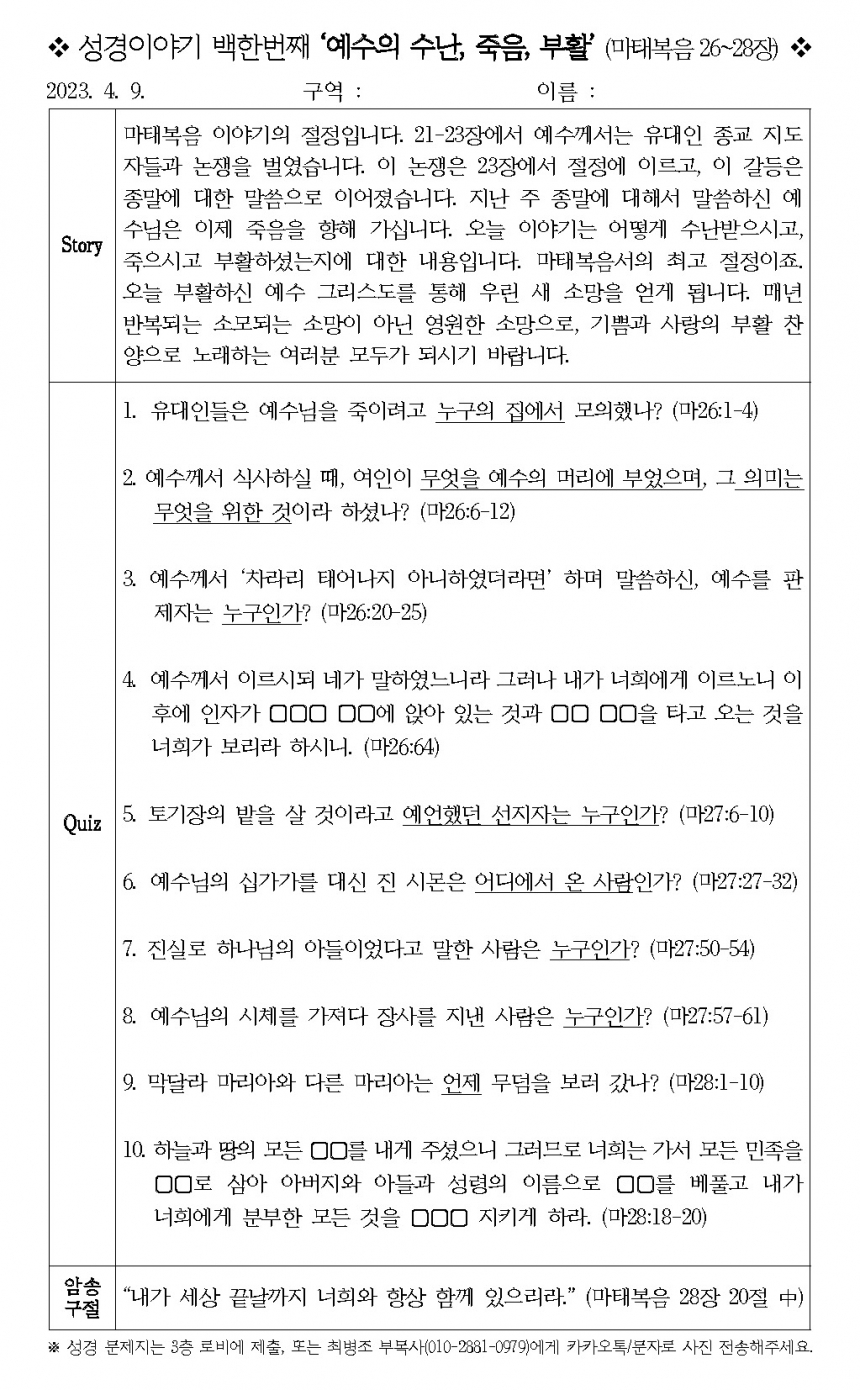 [¼º°æÄûÁî´ëȸ] ¼º°æÀ̾߱⠹éÇѹøÂ° '¿¹¼öÀÇ ¼ö³,Á×À½, ºÎȰ' (¸¶Åº¹À½ 26~28Àå)